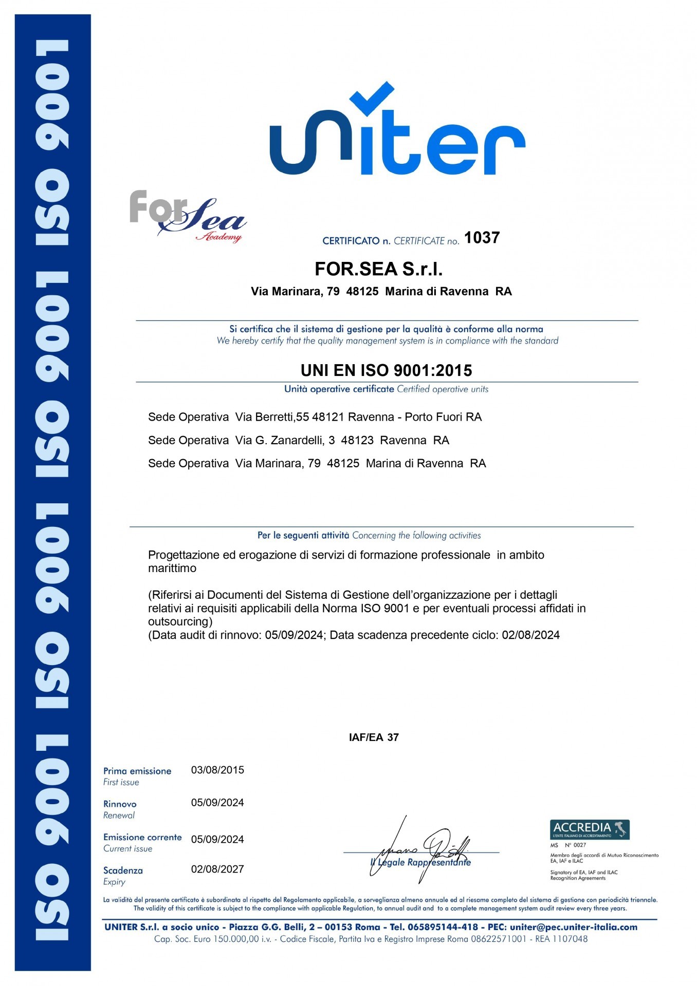 For Sea S.r.l si è posta l'obiettivo di sviluppare servizi e prodotti di standard sempre più elevati ed innovativi ampliando i settori nei quali svolge le proprie attività. Per conseguire e mantenere nel tempo gli obiettivi prefissati, la società adotta un sistema di gestione per la qualità basato sulle norme